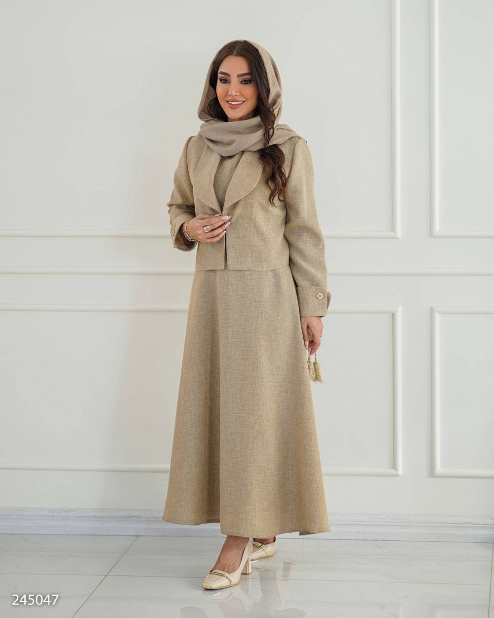 جزئیات: یقه آرشال .پشت سارافن زیپ دار.