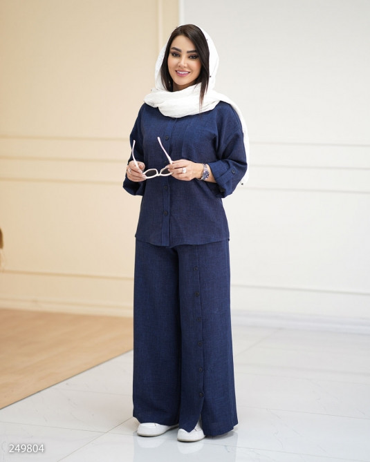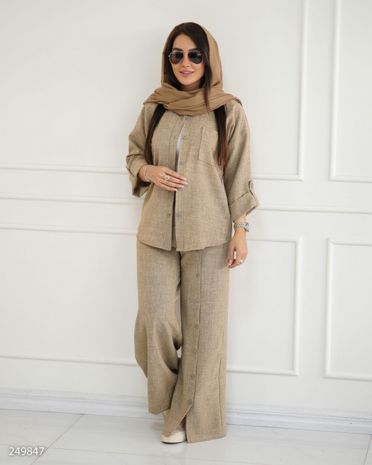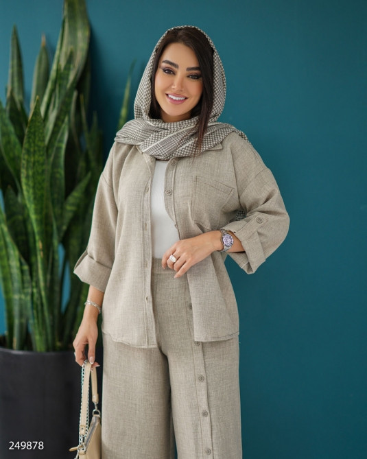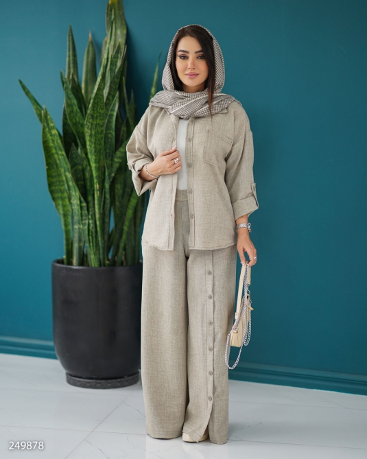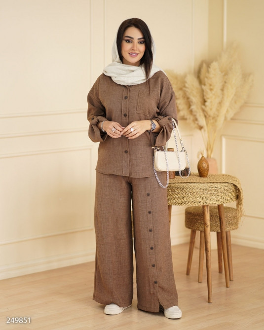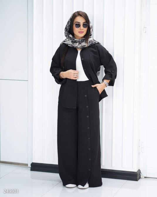 جزئیات: آستین پاگون دار.پشت شلوار کمر کش.جیب دار.دمپا چاکدار.