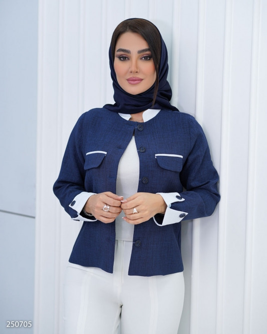 یقه ایستاده .آستین پاکتی.پیش کار لایی.جیب نما
